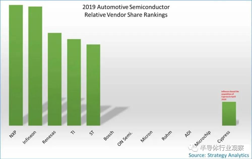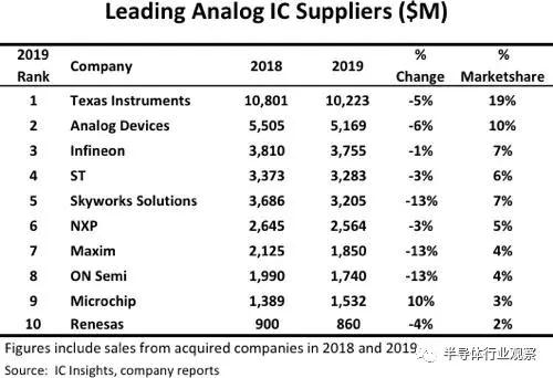 2020年第三季度手機(jī)芯片組市場(chǎng)份額 在模擬芯片領(lǐng)域,德州儀器和ADI常年穩(wěn)坐第一和第二的位置,尤其是德州儀器自2011年登上模擬IC巨頭寶座之后,此后近20年幾乎未發(fā)生過易主。前十中還有Maxim(ADI正欲將其收購(gòu))、Skyworks、安森美和Microchip。來到汽車芯片市場(chǎng)上,北美在2019年占據(jù)全球汽車芯片市場(chǎng)33%的主導(dǎo)份額。安森美是汽車CIS領(lǐng)域的龍頭,其市場(chǎng)占有率超過50%;美光是汽車內(nèi)存領(lǐng)域無可爭(zhēng)議的領(lǐng)導(dǎo)企業(yè);ADI這幾年將汽車領(lǐng)域視作新寵,先后收購(gòu)了電源巨頭Linear和Vescent Photonics公司的固態(tài)激光束控制技術(shù)。此外值得一提的還有特斯拉的FSD芯片也在行業(yè)獨(dú)樹一幟、