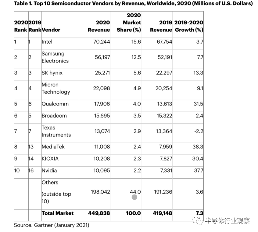 回望美國(guó)歷史,一代又一代的政客、分析機(jī)構(gòu)以及新聞工作者無不在推動(dòng)半導(dǎo)體業(yè)的發(fā)展。里根時(shí)代:“美國(guó)半導(dǎo)體工業(yè)的健康和活力對(duì)美國(guó)未來的競(jìng)爭(zhēng)力至關(guān)重要。我們不能讓它受到危害。——羅納德·里根(1987)克林頓時(shí)代:“美國(guó)半導(dǎo)體制造商的衰落……美國(guó)主導(dǎo)科學(xué)產(chǎn)業(yè)的日子可能已經(jīng)不多了……下游電子系統(tǒng)產(chǎn)業(yè)一連串下滑的第一張多米諾骨牌。”——行業(yè)評(píng)估(1999)奧巴馬時(shí)代:“半導(dǎo)體創(chuàng)新正在放緩……中國(guó)協(xié)同努力,利用政府引導(dǎo)的超過1000億美元的產(chǎn)業(yè)政策,以有利于自己的方式重塑市場(chǎng),這威脅到了美國(guó)產(chǎn)業(yè)的競(jìng)爭(zhēng)力。”——總統(tǒng)科學(xué)技術(shù)顧問委員會(huì)(2016)當(dāng)今:美國(guó)需要雄心勃勃地投資半導(dǎo)體研究....(或)面臨失去創(chuàng)新優(yōu)勢(shì)和全球競(jìng)爭(zhēng)技術(shù)領(lǐng)先地位的風(fēng)險(xiǎn)?!雽?dǎo)體行業(yè)協(xié)會(huì)2019年報(bào)告美國(guó)在半導(dǎo)體業(yè)務(wù)的制高點(diǎn)上擁有牢牢的控制權(quán),而半導(dǎo)體業(yè)務(wù)則主導(dǎo)著整個(gè)行業(yè)。首先來看全球整體的半導(dǎo)體廠商排名情況,前十中有5家都是美國(guó)的企業(yè)。英特爾當(dāng)然是美國(guó)最大的半導(dǎo)體生產(chǎn)商,也是世界上最大的微芯片制造商之一。美光排在第四,高通第五,德州儀器第七,英偉達(dá)第十。
