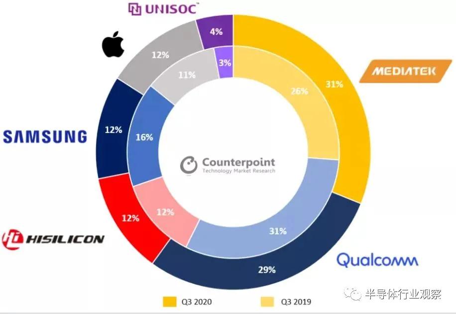 而具體到各個(gè)芯片領(lǐng)域,在手機(jī)芯片上,高通多年以來一直雄霸手機(jī)SoC龍頭的位置。也就只在2020年第三季度聯(lián)發(fā)科超越了高通。