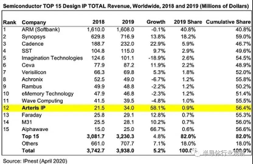 圖1:全球TOP15 半導(dǎo)體IP廠商排名